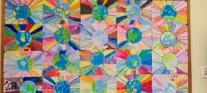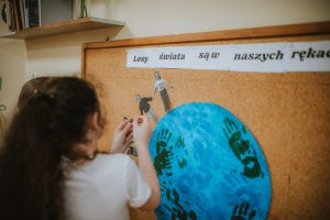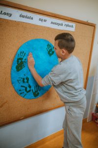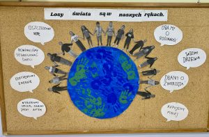 Dzieci wykonały wspólną pracę plastyczną przedstawiającą kulę ziemską, ozdobioną kolorowymi odbiciami swoich dłoni. Wokół niej umieszczono sylwetki dzieci, co symbolizuje jedność i wspólną odpowiedzialność za Ziemię.