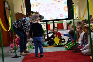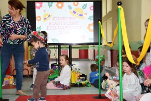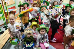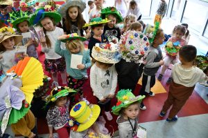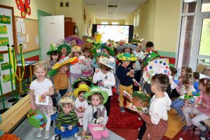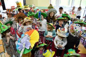 Dzieci wspólnie z rodzicami wykonały piękne wiosenne kapelusze wykorzystując różne materiały przeznaczone do recyklingu. Prace wyróżniały się dużą kreatywnością oraz walorami estetycznymi. Kolorowe kapelusze zostały wyeksponowane na szkolnej wystawie i pięknie zdobiły korytarz, wprowadzając radosny i wiosenny nastrój.