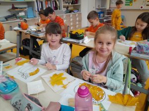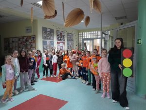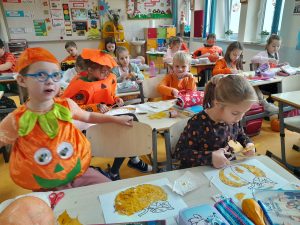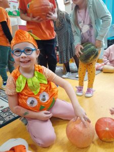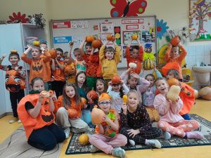 W tym roku Święto Dyni celebrowaliśmy pomarańczowym strojem, w sali udekorowanej dyniowymi akcentami, girlandmi, w otoczeniu przeróżnych dyń i dyniek. Była to doskonała okazja, by poznać pochodzenie, różne odmiany dyń, znaczenie i wartości odżywcze tego warzywa. Na naszym klasowym stole pojawiły się smakołyki dyniowe: zupa, babeczki, dżem, olej z pestek dyni. Uczniowie mogli wykorzystać swoją kreatywność podczas zajęć plastycznych o tematyce jesiennej. Uzupełnieniem zajęć były zabawy ruchowe i muzyczne z nietypowym przyborem w „kolorze pomarańczowym”.